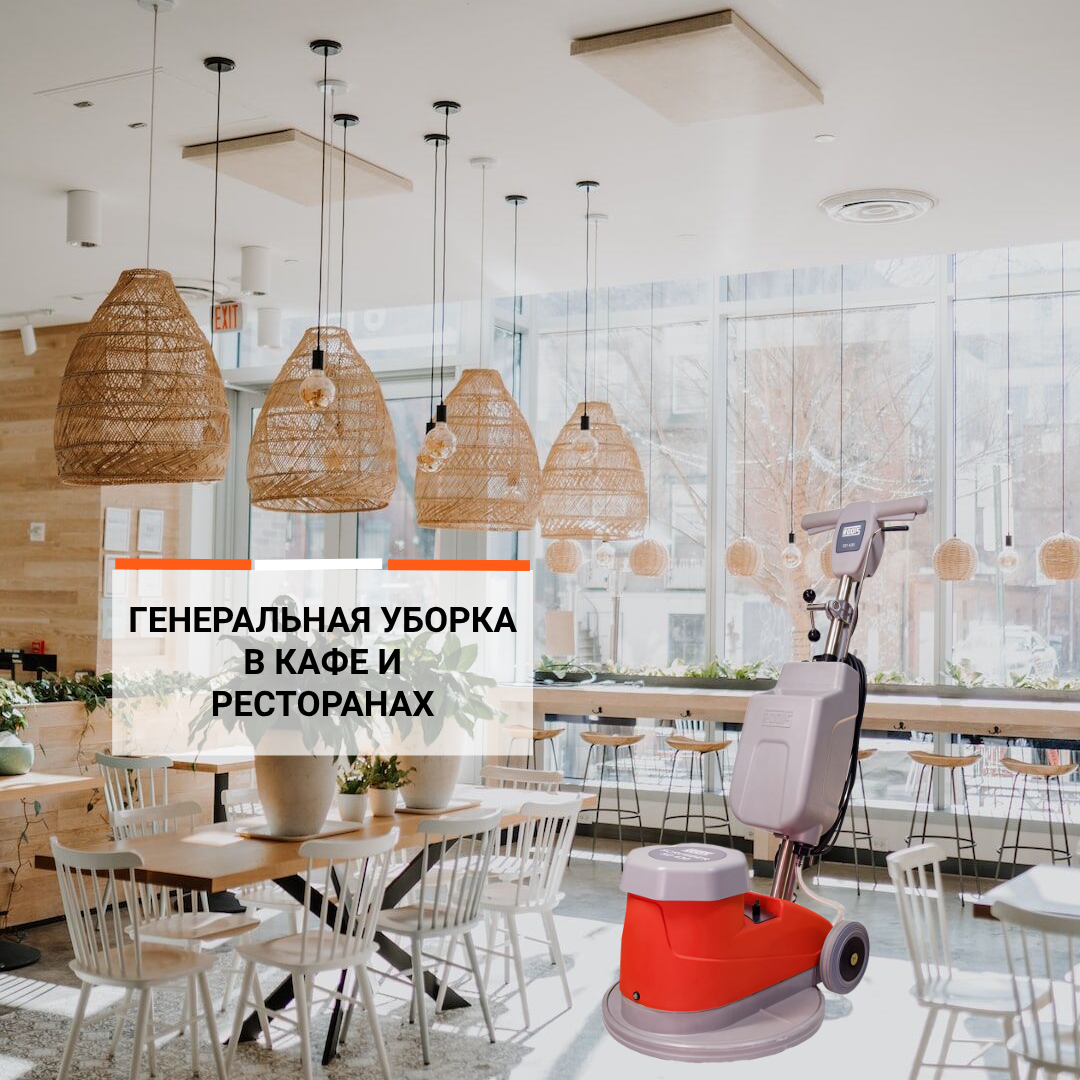 Тщательную, глубокую очистку пола проводят во время генеральной уборки. Ручной метод предполагает поэтапное воздействие на пятна с помощью профильных химических компонентов с последующей промывкой всей поверхности пола. Для оптимизации процессов генеральной уборки напольных покрытий в кафе и ресторанах используют роторные поломоечные машины.